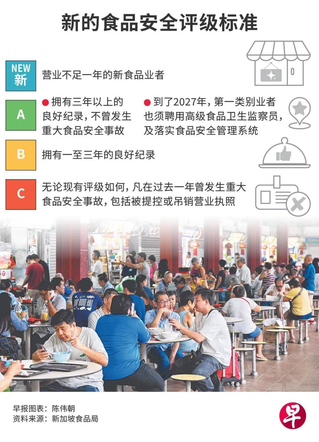 成功开业只是起头,正在新的SAFE框架下,维持高档级的食物平安评级间接关系到店肆的声誉取客源。该框架将全岛约4。5万个食物业者分为两类进行办理,你需要起首明白本人的类别。第一类别业者处置大规模食物加工或处置,包罗餐饮供应商、厨房面积达16平方米或以上的餐馆、约占总数四分之一。第二类别业者处置中小规模运营,厨房面积小于16平方米的餐馆、面包店、超市等,占总数的四分之三。明白分类后,至关主要的即是理解全新的评级尺度。SAFE框架的最大改变正在于,评级不再纯真依赖稽察时的现场情况,而是以过往的食物平安记实为次要根据。按照新尺度,停业不脚一年的新业者将被标识表记标帜为“新”。要获得最高的“A”级评级,业者必需具有3年以上的优良记实,且期间不曾发生严沉食物平安变乱。对于第一类此外业者(如大型餐馆),要求更为严酷:从2027年起头,要连结“A”级,除三年优良记载外,还必需聘用持有高级证书(WSQ四级)的食物卫生监察员,并落实食物平安办理系统。具有1~3年优良记实的业者可获得“B”级。而无论现有评级若何,只需正在过去一年内发生如被提控、因虫害或卫生问题被吊销执照等严沉食物平安变乱,评级将间接被降至最低的“C”级。据SFA预估,届时近八成业者能获A或B级,而C级业者将少于1%,这会使C级店肆正在市场所作中处于极为晦气的地位。